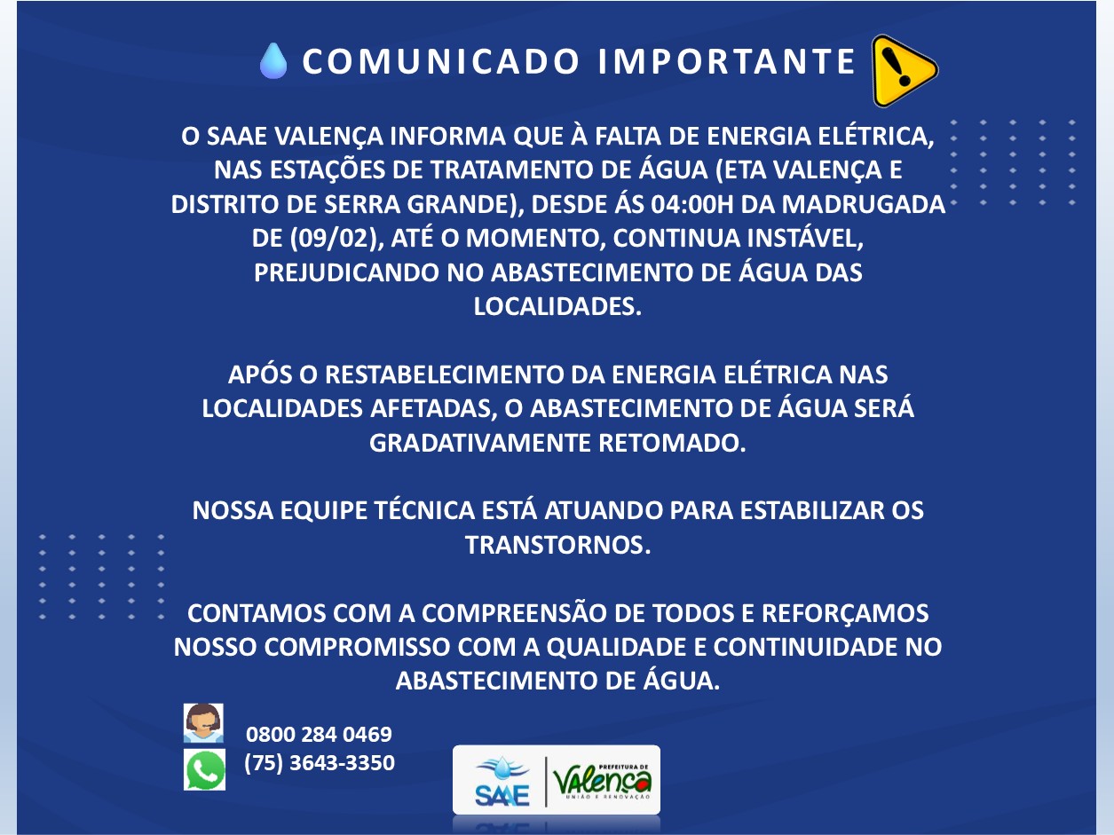 O SAAE Valença (Serviço Autônomo de Água e Esgoto de Valença) é a entidade responsável pelo abastecimento de água tratada e pela gestão do sistema de esgotamento sanitário na cidade de Valença, localizada na Bahia. Criado com o objetivo de garantir a qualidade e a regularidade do fornecimento de água para os moradores e promover saneamento básico, o SAAE desempenha um papel essencial para a saúde pública e o desenvolvimento sustentável da região.