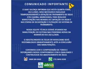 COMUNICADO IMPORTANTE! O SAAE VALENÇA INFORMA QUE NESTA QUARTA-FEIRA, 19/11/2025, SERÁ NECESSÁRIO PARALISAR TEMPORARIAMENTE A ESTAÇÃO DE TRATAMENTO DE ÁGUA (ETA CAJAÍBA, MARICOABO), PARA REALIZAR