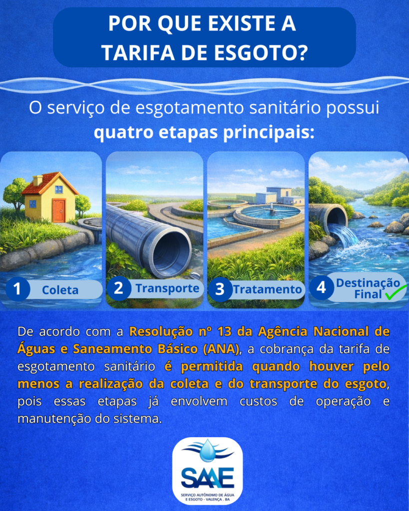 O Serviço Autônomo de Água e Esgoto de Valença (SAAE) vem promovendo uma série de ações para ampliar e fortalecer o sistema de esgotamento sanitário no município. A implantação da Tarifa de Serviços de Esgotamento Sanitário (TSES) representa um passo importante para garantir recursos destinados exclusivamente à expansão, manutenção e melhoria dessa infraestrutura essencial para a cidade.
